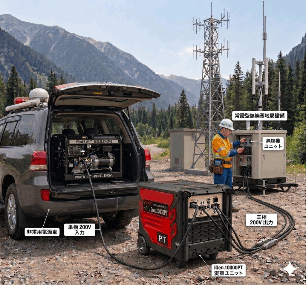 iGen.10000PTは、電源車から供給される単相200Vを、極めて安定した高品質な「三相200V」へと変換します。これにより、既存の電源リソースを最大限に活用し、特殊な大型発電機を別途手配することなく、迅速に基地局のバックアップ体制を構築することが可能となりました。